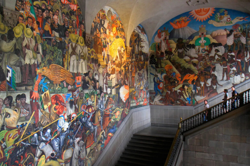 Ante las escaleras del Palacio Nacional de México, mi mujer y yo contemplamos el fastuoso mural de Diego Rivera, pintado entre los años 1929 y 1935 por encargo del entonces secretario de Educación Pública, José Vasconcelos, como impulso a lo que significaría el auge del muralismo, llamado “Epopeya del pueblo Mexicano”.